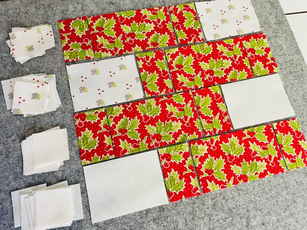 Right away I decided to make some fabric changes. I made the background really light and chose a bright red mistletoe fabric for all the hard candy units.