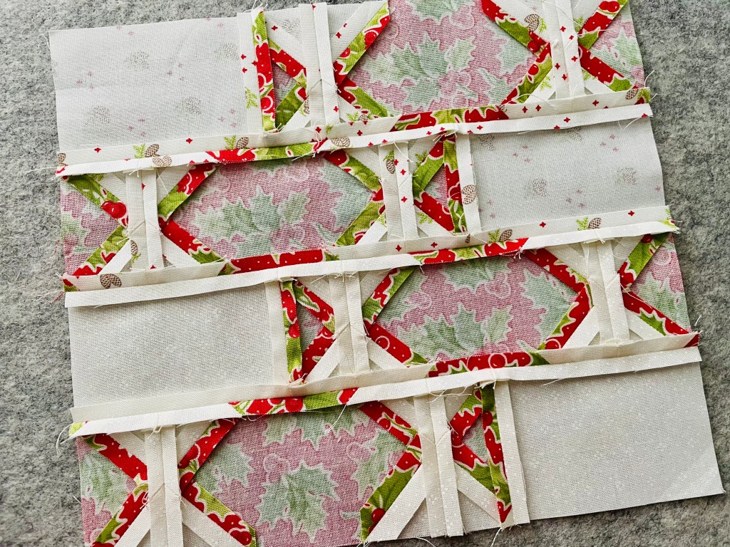 Want a tip on how to put this block together quickly? Chain piecing all those tiny stitch and flip pieces will speed up the construction of this block.