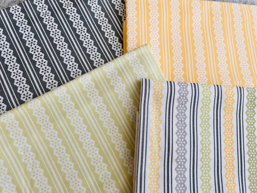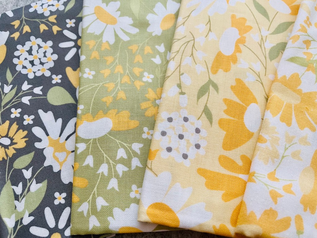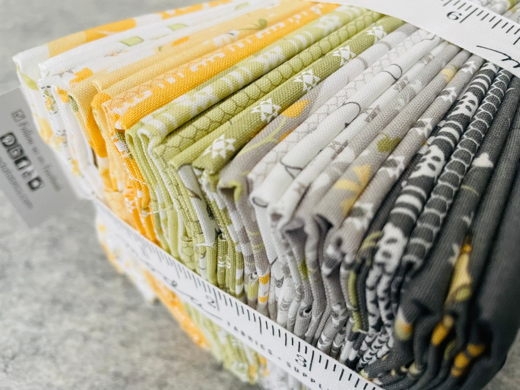 This collection just screams spring with all the bright and happy yellows and greens. How could I not buy this??? Now I know winter is just around the corner, but let’s think ahead for a second. By the time you use this fabric in a quilt, it will probably be ready just in time for spring to display it on your bed or quilt rack. Plus, Corey Yoder just started a free sew along that uses this exact fabric collection (which turned into my perfect excuse for why I had to buy it!) Let’s open up this bundle and take a closer look.