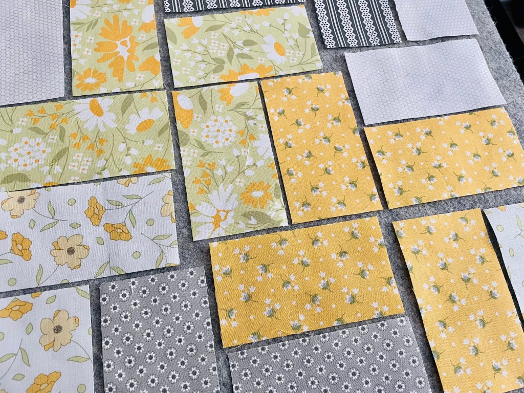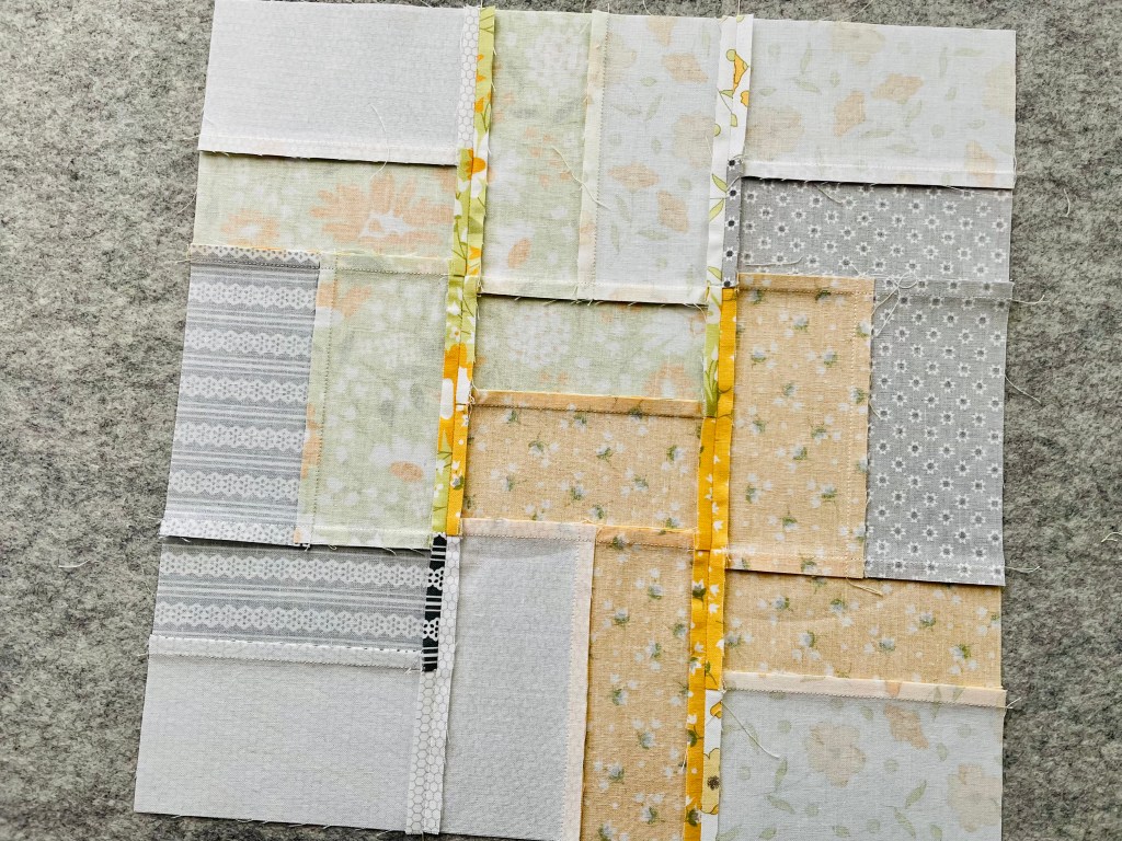 Feel free to have fun with color placement and try out different combinations! I chose my favorite fabrics and used them in this first block. This time I decided to follow Corey’s suggestion and pressed most of my seams to the dark side.