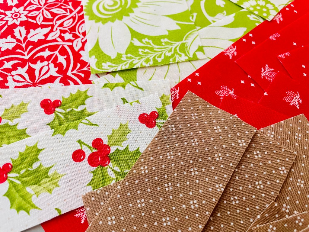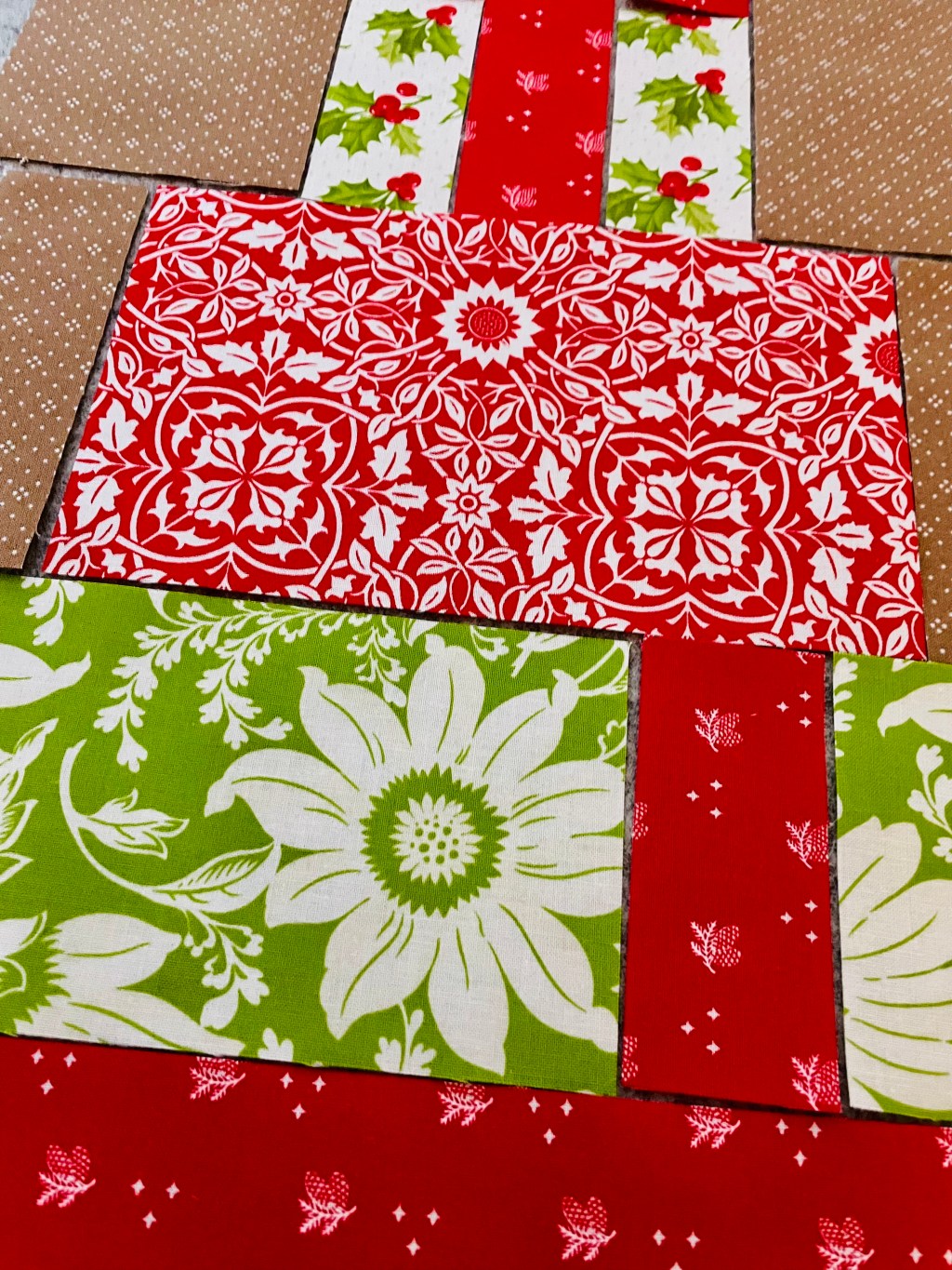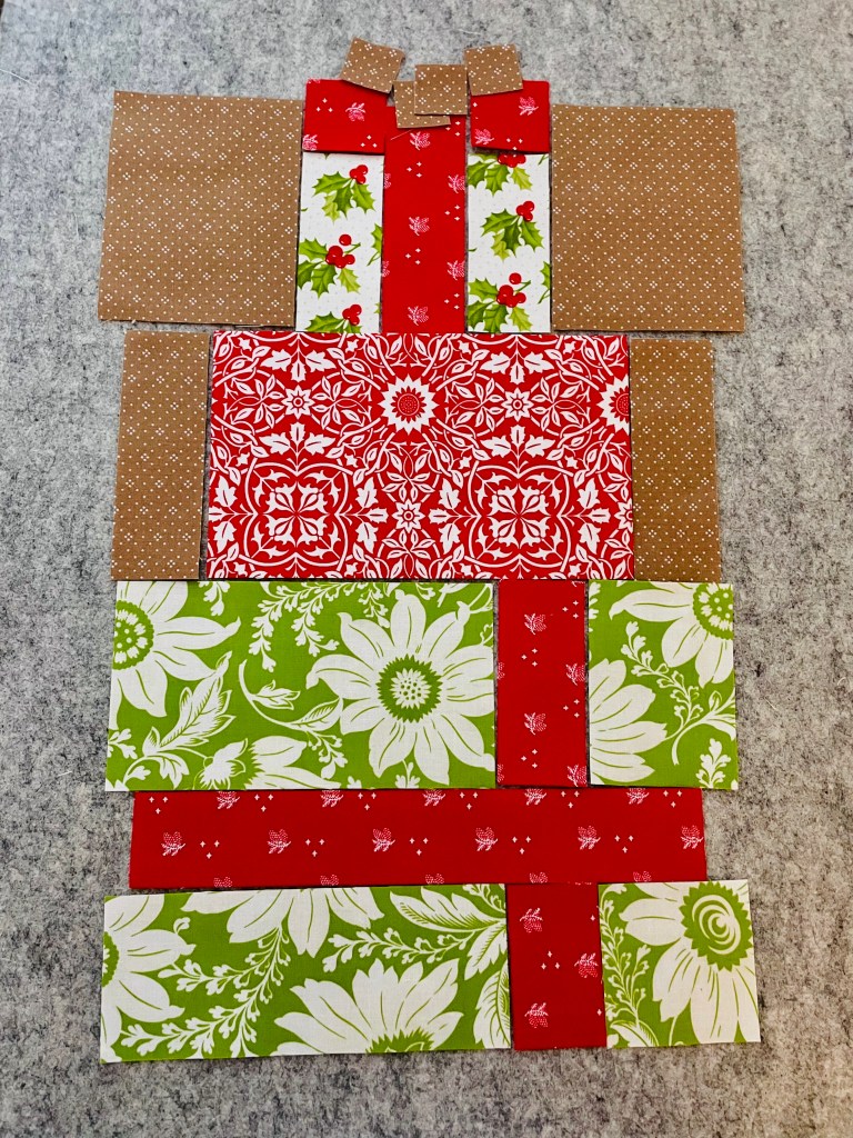 We are wrapping up the Christmastime sew along now that the last block has been released. I think it’s my favorite block of the whole quilt! Who doesn’t like presents during Christmas? Once again I decided to change up my fabrics a little by choosing a darker background fabric and making the top present a little lighter.