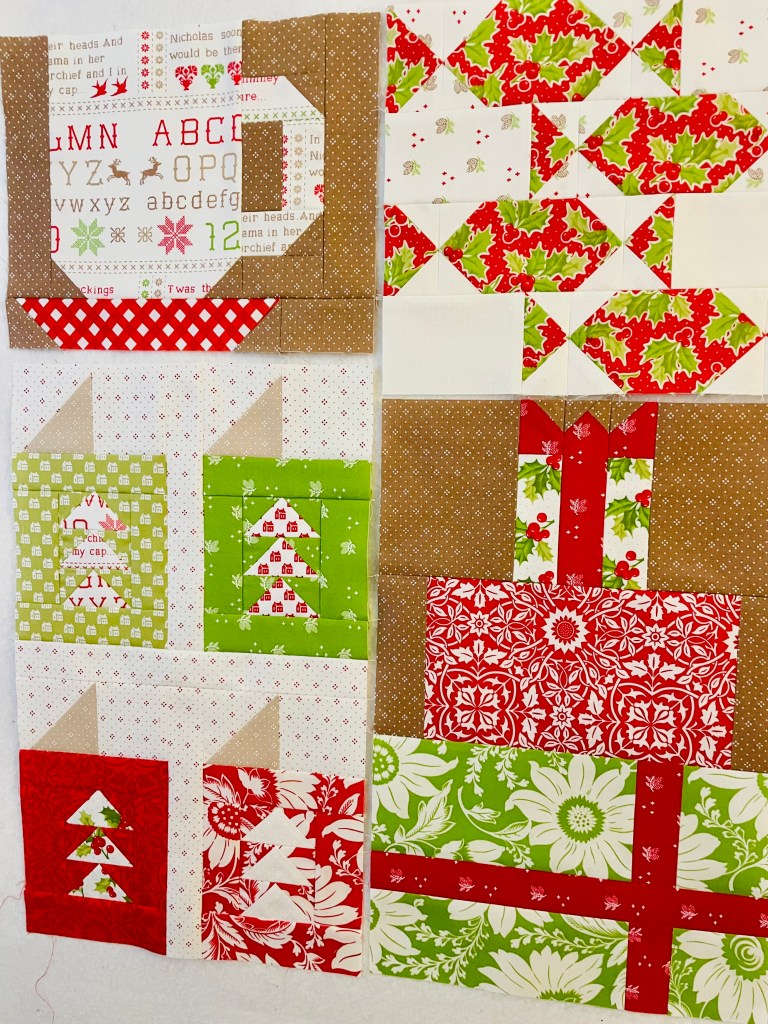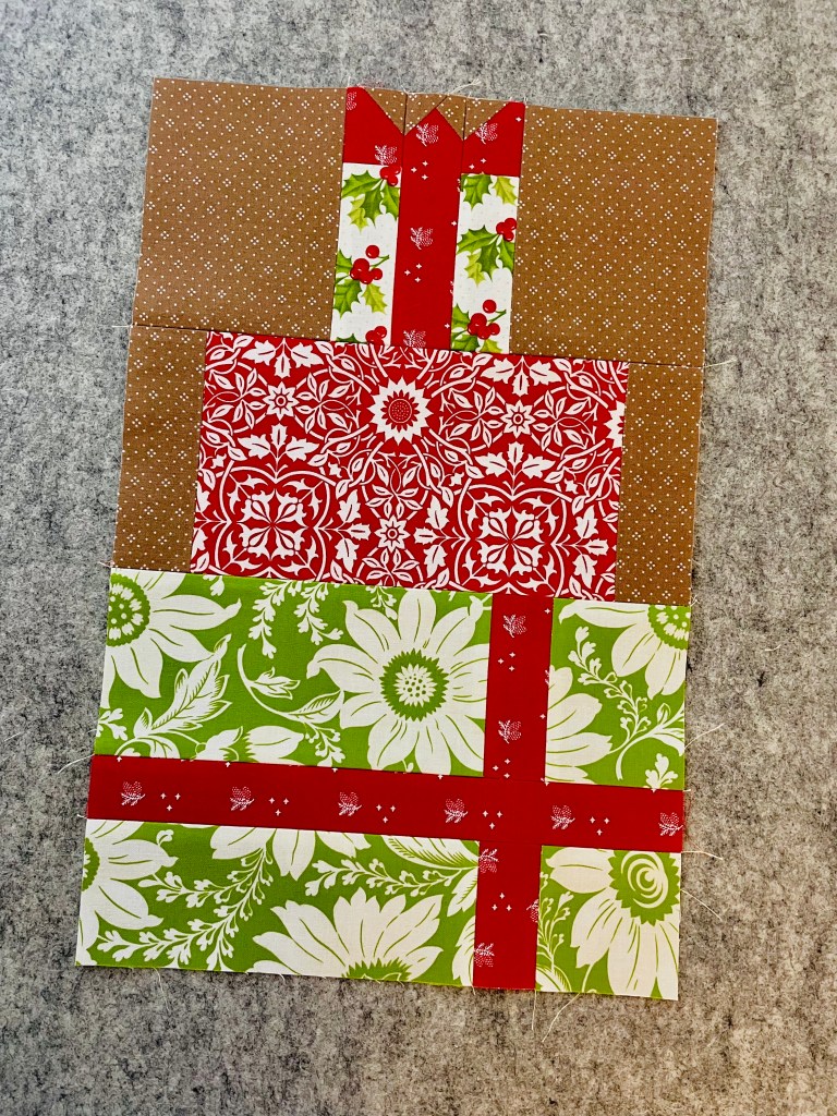 The rest of this block went together super quick and suddenly I had three beautiful presents ready to be placed under the Christmas tree! I have to admit the Christmas Stitched fabrics really make this block pop.