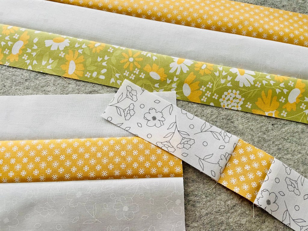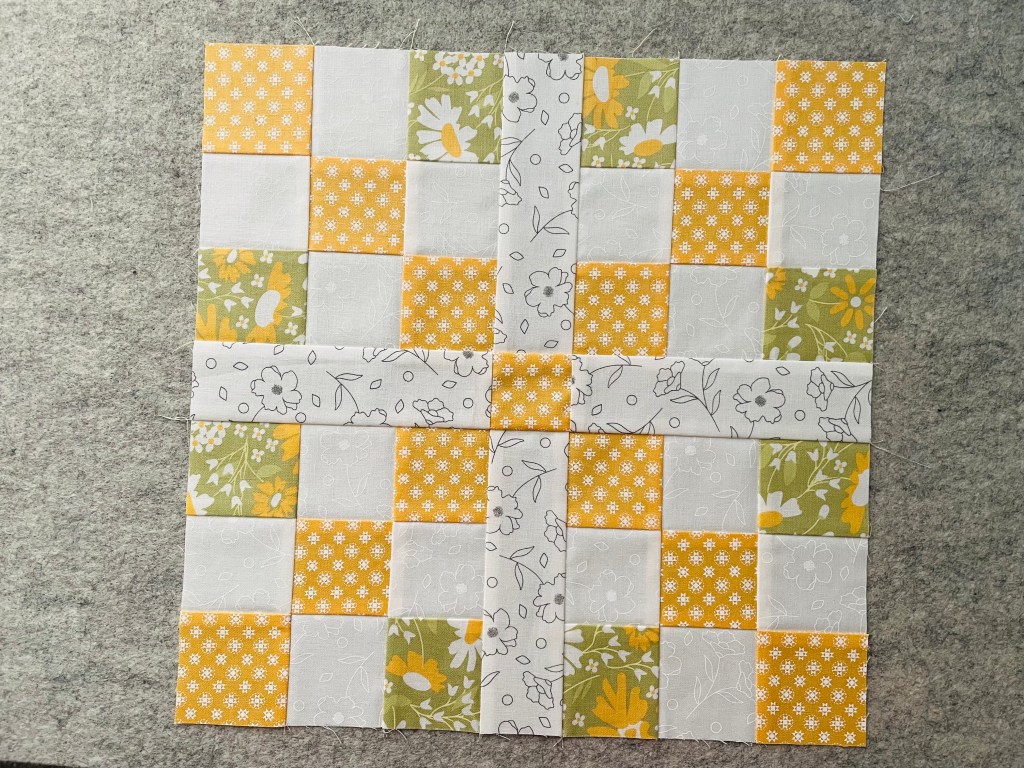 I decided to use this gorgeous background fabric with the drawn flowers and put it in the middle sashing of the block. It pairs perfectly with the rest of the fabric choices and gives the block a more interesting look.