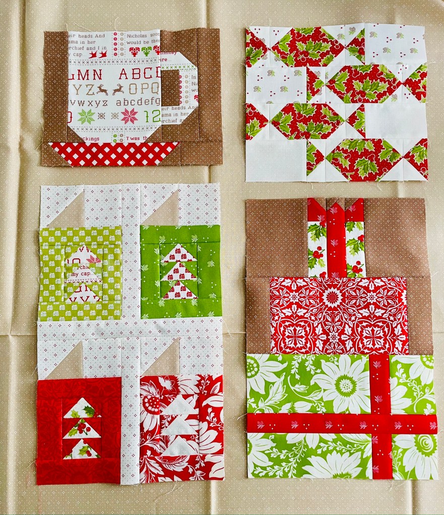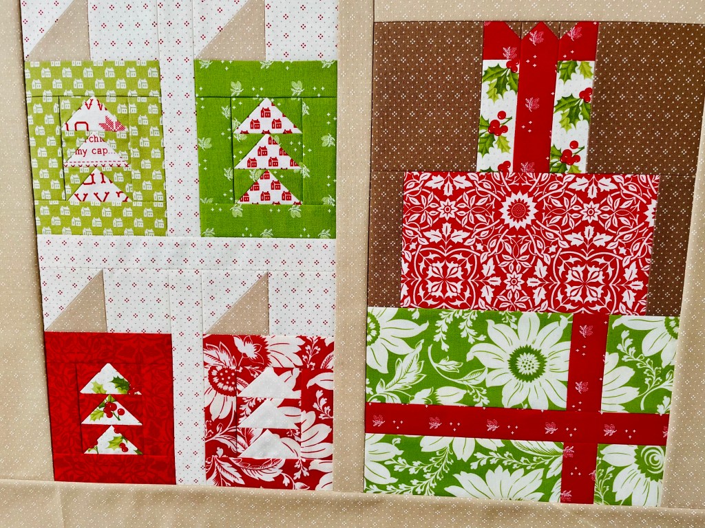 Remember the original background fabric that comes in the Christmastime quilt kit from Fat Quarter Shop? Obviously I didn’t really use it the whole sew along, but I did decide to finish my quilt with that fabric! I was nervous at first because I wasn’t sure if it would look good, but I decided to open up that fabric and place my blocks on it to get a general idea of what it would look like. To my surprise, it totally worked well with the blocks!