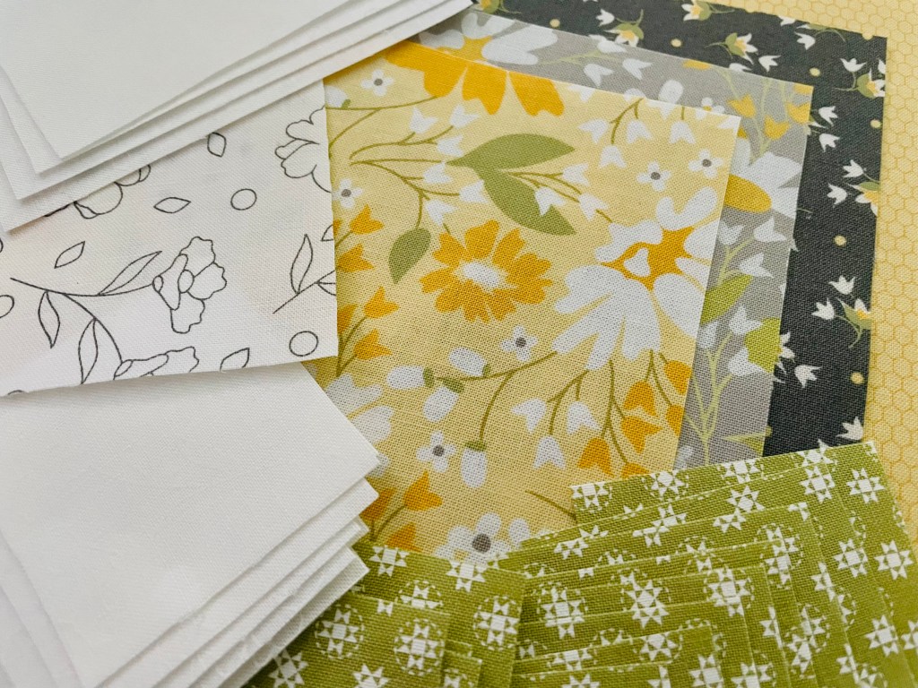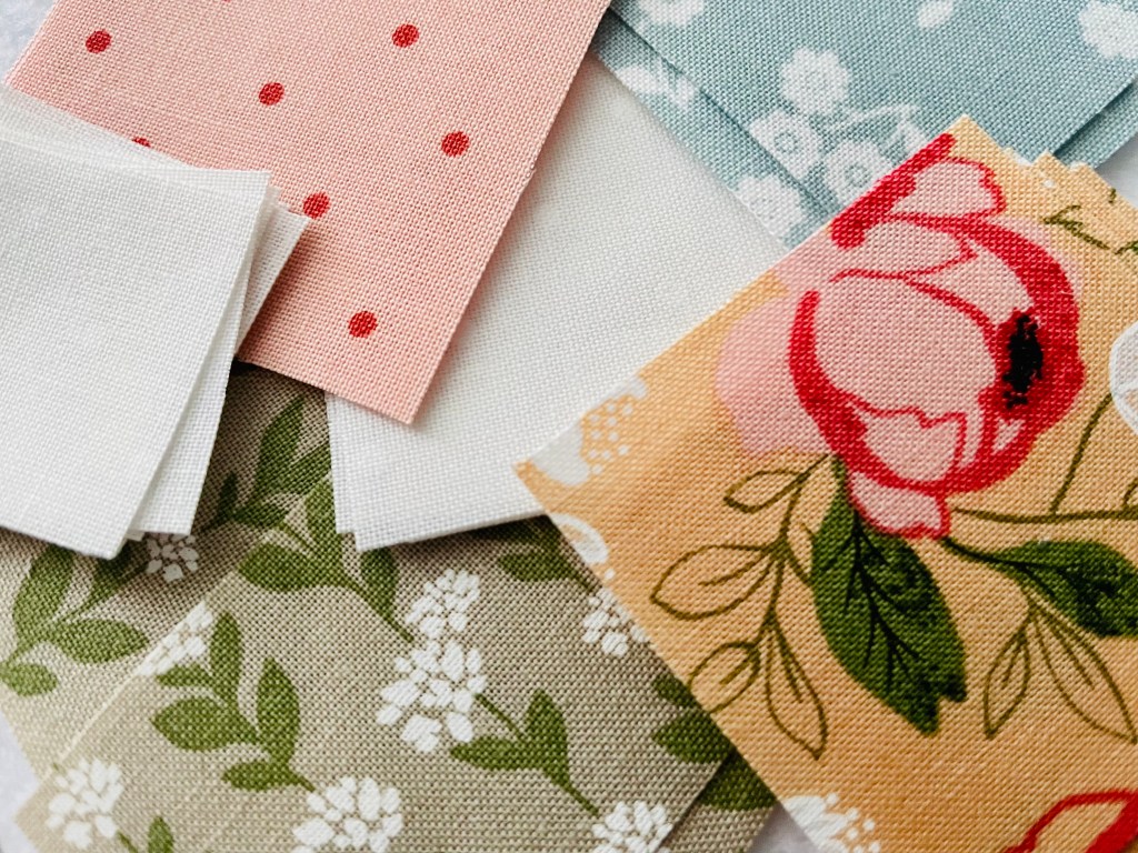 As mentioned in the previous post, I am using Lella Boutique’s latest fabric collection called Country Rose for this sew along. My goal for this first block was to make it happy and bright. I decided to leave out the black for this week, but plan to use it every other week so it doesn’t take over the quilt. I realized pretty quick after cutting that even the 6″ block pieces are pretty small and I couldn’t imagine sewing the 3″ block! Maybe next year we’ll give that a try 🙂