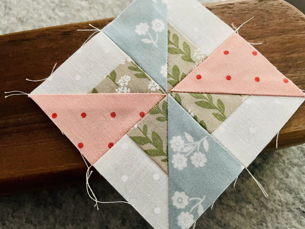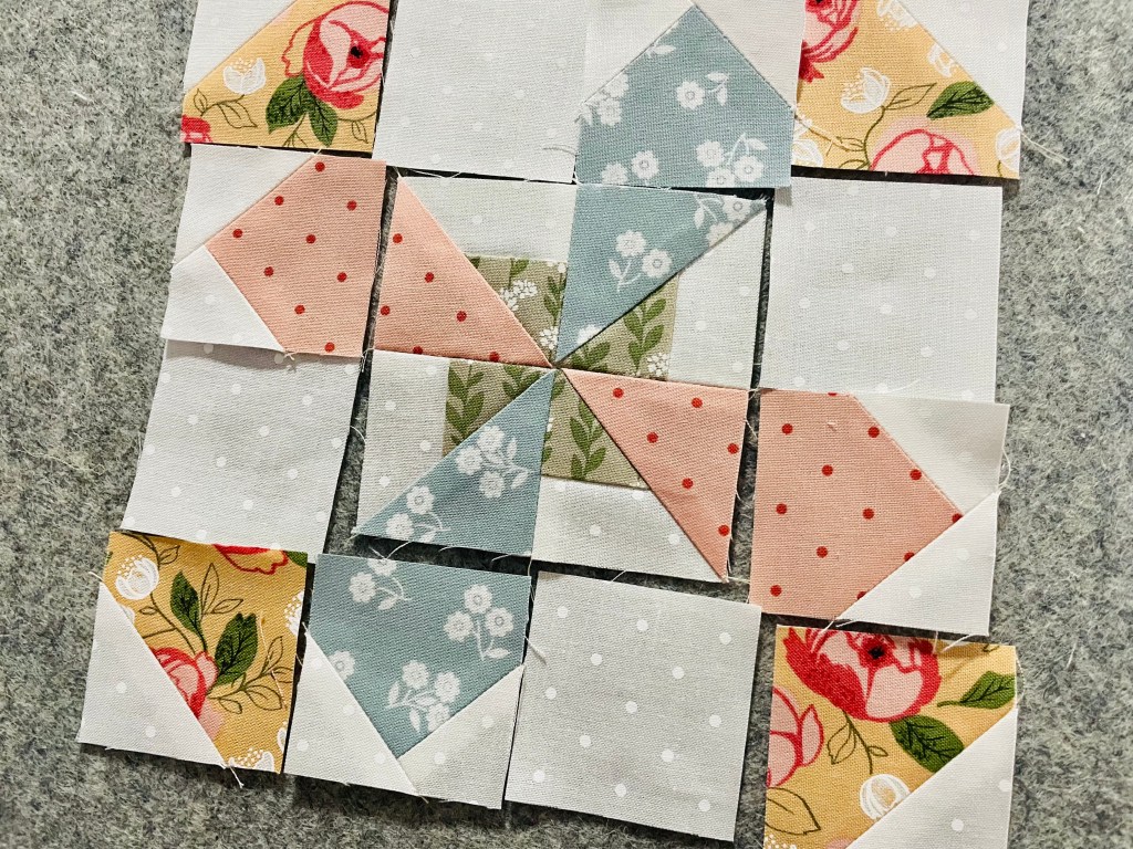 I decided to put this block together in a different order and worked from the middle first. It just made more sense in my brain. I also wasn’t quite sure how I was going to press my seams, so I made my decisions last minute based off of how the fabric was acting. I ended doing a combination of pressing to the side and pressing open. I think it worked out pretty well!