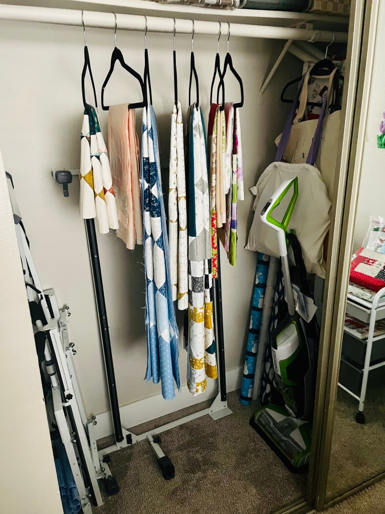 Look at all the room in there! My goal was to have enough space so I could easily take out the Cutie Frame when needed and put it back. My favorite part is that I can close the door to hide it when not in use. I can also see all my finished quilts that are nicely hung up and waiting to be quilted. Plus it makes sense for them to be by the Cutie Frame!
