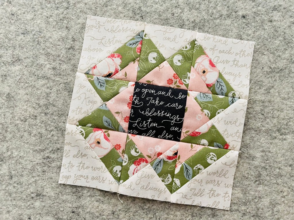 If I were to do this block again I would choose different colors. For some reason I am not loving the pink up against that green. It blends together too much and loses the work I put into it. Oh well. It’s going in the quilt and I won’t think anymore about it!
