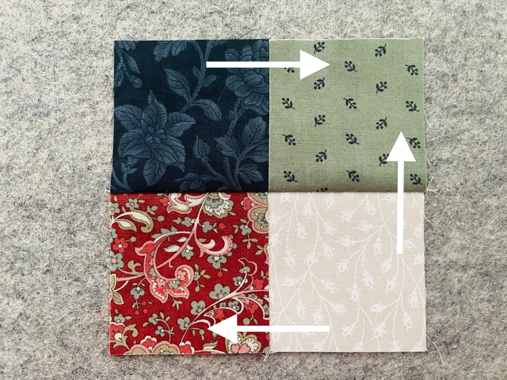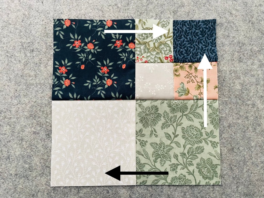 To follow along, turn to page 4 in the Hopscotch Quilt Pattern! I’ve added arrows to each picture below to show which way to press.