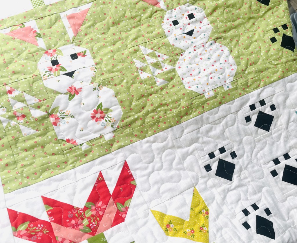 This pattern has a little bit of everything with newly designed blocks that are different from your traditional style blocks we usually see in quilts. From an easy, beginner friendly star block to a more intermediate level bunny block, this pattern gradually increases in skill level as you sew.