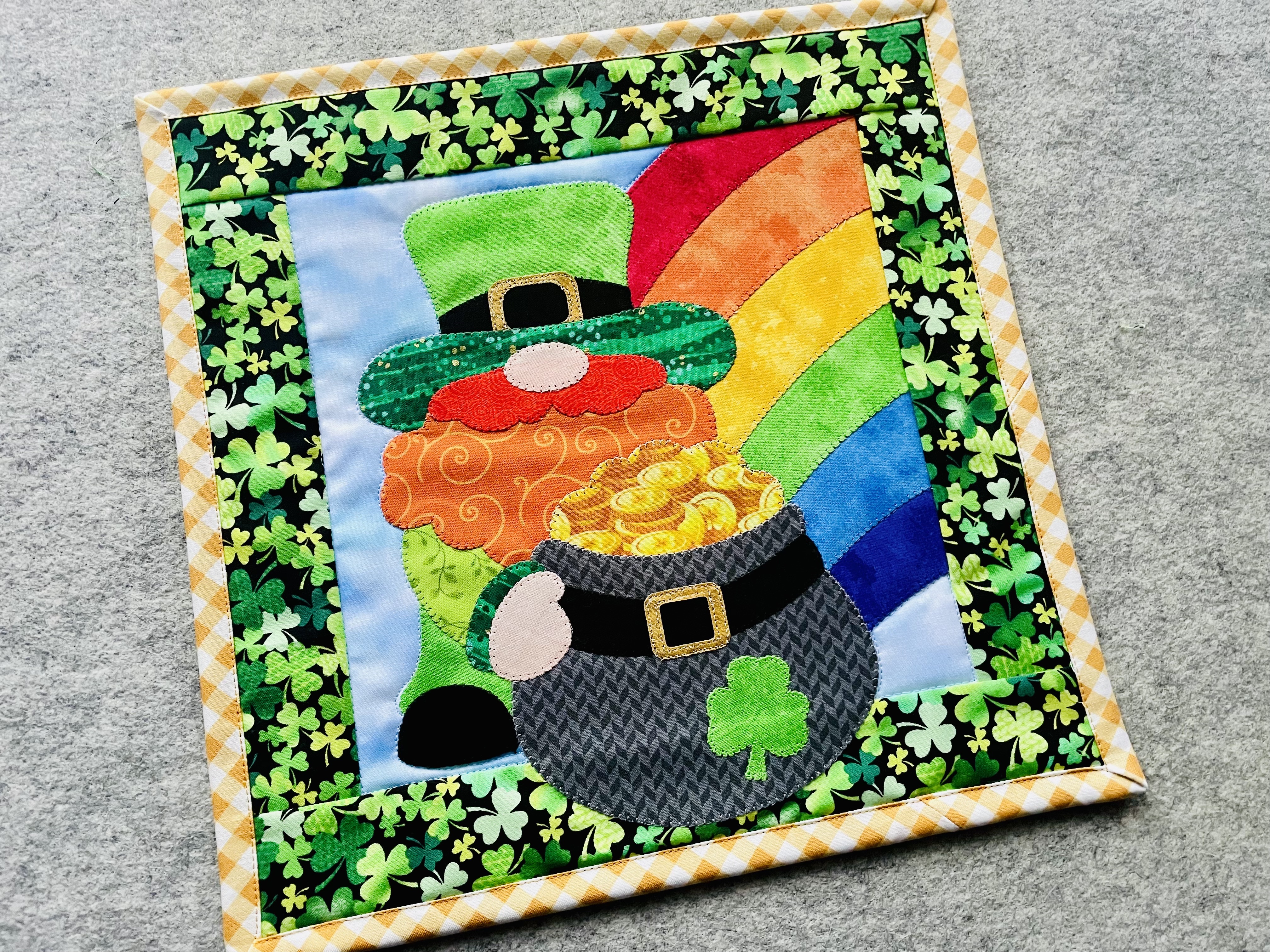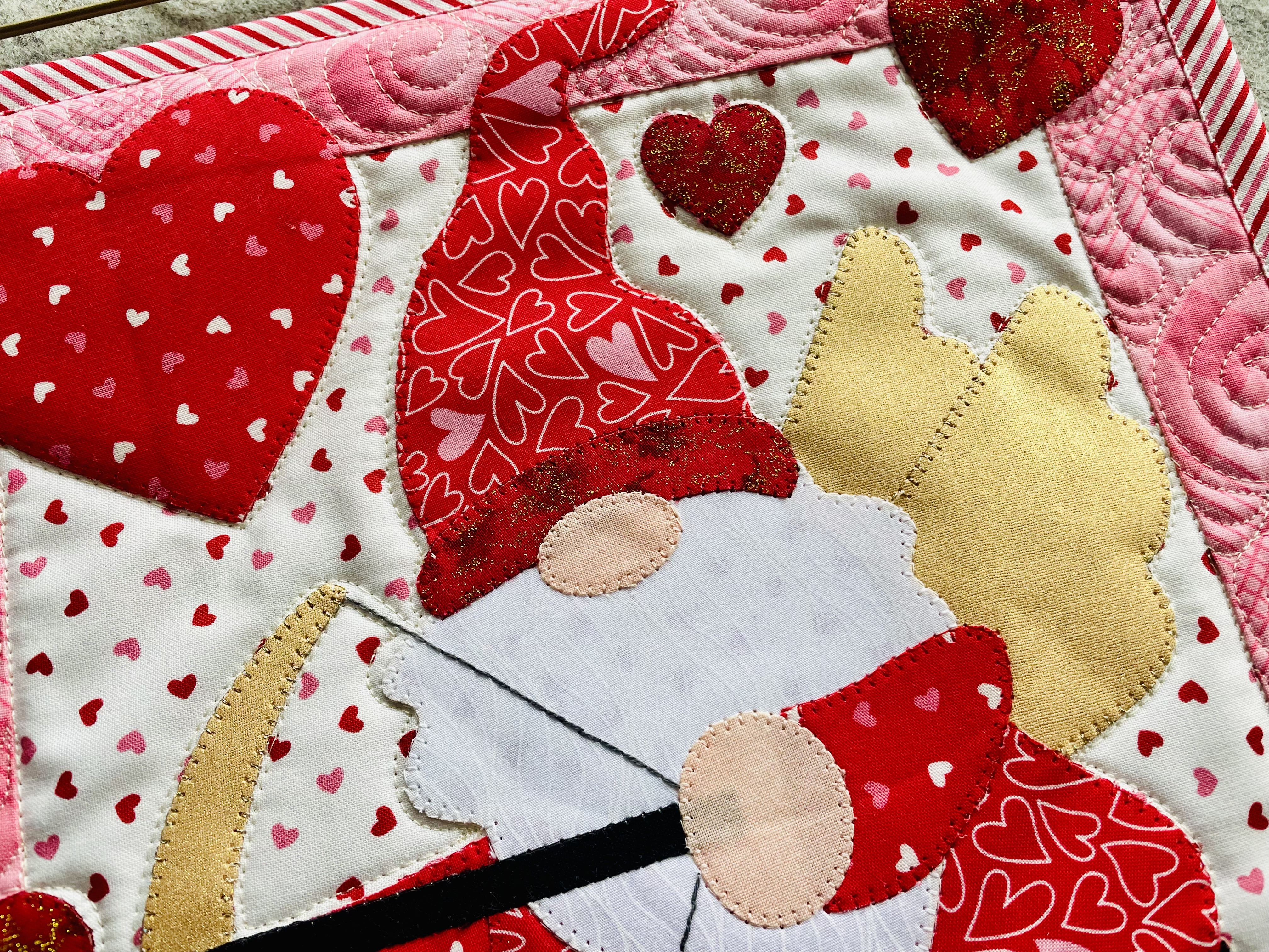 I love me some laser cut applique! Shabby Fabrics is hosting this adorable sew along that mails me a cute little gnome wall hanging kit each month. I get everything I need including the backing! I’ve also learned how to make hanging sleeves because of this sew along. Check out Shabby Fabric’s website to see if you can do it too!